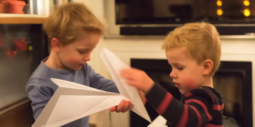 Two young boys holding paper planes and smiling | Source: Midjourney