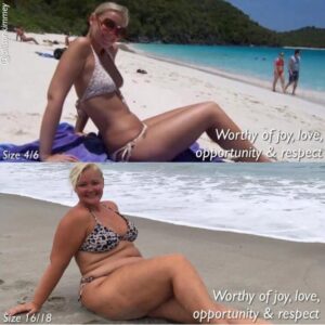 She shared how unhappy she was in her “before” picture, constantly comparing herself to other women and battling insecurities. Now, with her current body, she embraces self-love and confidence, proving that beauty is not defined by size.