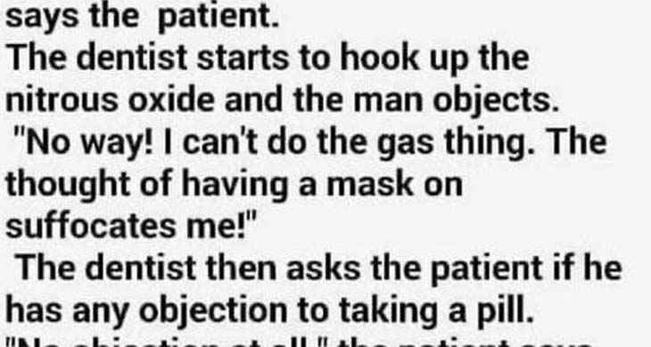 The dentist then asks the patient if he has any objection to taking a pill. “No objection at all,” the patient says.