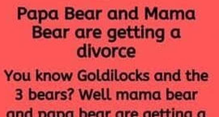 Papa Bear and Mama Bear are getting a divorce.You know Goldilocks and the 3 bears? Well mama bear and papa bear are getting a divorce.In court they bring in baby bear. The judge puts baby bear on the stand and asks him who he’d like to live with?“
