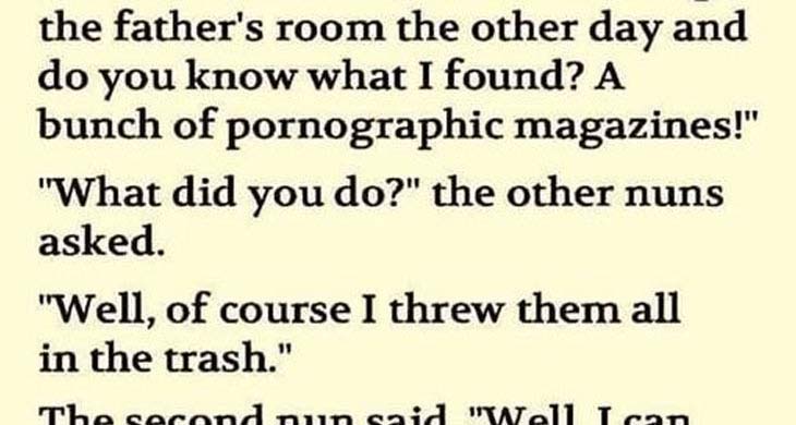 Three nuns were talking. The first nun said, “I was cleaning the father’s room the other day and do you know what I found? A bunch of pornographic magazines!” “What did you do?” the other nuns asked….