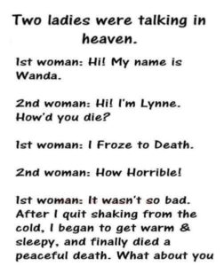 1st woman: Too bad you didn’t look in the freezer… we’d both still be alive.