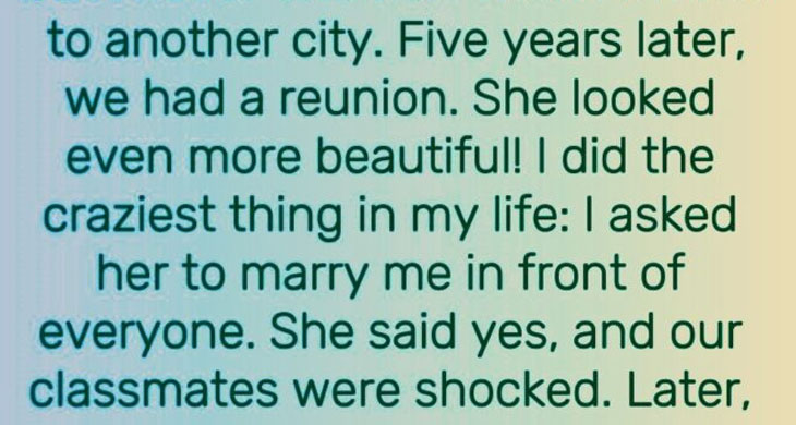 After 5 years, my classmates planned a reunion. I saw her there, and she looked even more beautiful! I did the craziest thing in my life: I asked her to marry me in front of everyone. She said yes, and our classmates were shocked.