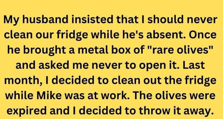 Mike’s unusual behavior focused on a metal can in the fridge, which he claimed contained rare olives. For years, he was adamant Stephanie never touch it. One day, while cleaning the fridge in his absence, Stephanie found the can leaking. Thinking it was expired, she decided to throw it away, but as it spilled, she realized the contents were not olives but two preserved umbilical cord pieces.