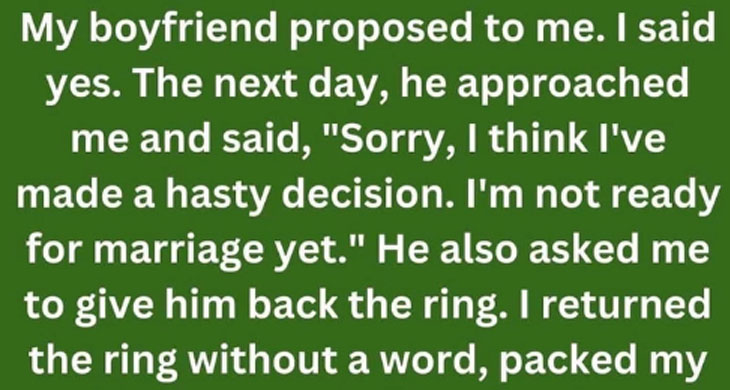 “Sorry, I think I’ve made a hasty decision. I’m not ready for marriage yet.” He also asked me to give him back the ring. I was floored.