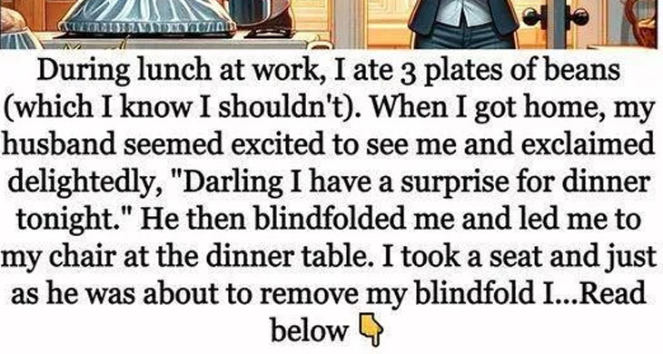During lunch at work, I made the regrettable choice to eat three plates of beans. When I got home, my husband excitedly greeted me with a surprise dinner and blindfolded me. Just as he was about to remove the blindfold, the phone rang, and he left to answer it.