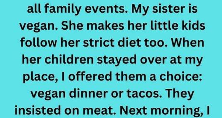 During a sleepover at Kate’s house, her children wanted tacos, and her niece and nephew asked for the same, so she served them meat. She jokingly told them not to mention it to their mom. The next morning, her sister found out and was furious, accusing Kate of betrayal and disregarding her beliefs.