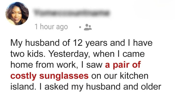 Returning home from work, I found a pair of expensive sunglasses that weren’t mine. My husband and son’s explanation left me with more questions than answers. When I dug deeper, I uncovered a truth that left my world in pieces.