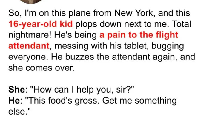 “Hurry up with my snack! Don’t just stand here and stare at me like a statue!” The attendant, teary-eyed but composed, walked away.”Your parents must be so disappointed in you,” the older man remarked, returning to his magazine. “Mind your own business, old man!” Andrew replied dismissively. “I paid for this flight; I deserve good service.” When the attendant returned with pretzels, Andrew, unimpressed, slapped the tray away. “I want something better!””That’s all we have, sir,” the attendant responded, tears in her eyes. Andrew’s loud insults attracted the attention of another passenger, a woman who confronted him.