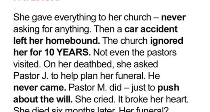 though heartbroken, accepted it in silence. The final betrayal came when Eleanor, nearing death, asked to see Pastor J. one last time. Instead, Pastor M. showed up, asking only about her will. He didn’t ask about her soul—just her money. Eleanor cried, feeling not just abandoned, but reduced to a transaction. Before she died, Eleanor made sure her story would not be forgotten. At her funeral,