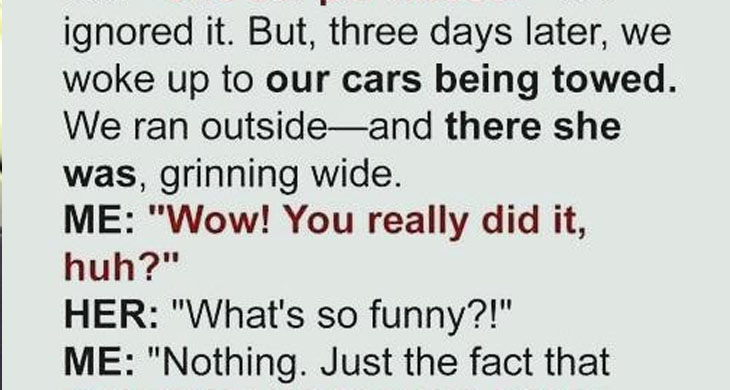 Although both our cars fit perfectly, Lindsey insisted it applied to everyone, including temporary residents like us.We politely accepted the cookies, dismissing her concerns as over-the-top. But three days later, I woke to the sound of tow trucks. Both our cars were being lifted off the driveway. In the cold morning light, I saw Lindsey standing in her bathrobe, sipping coffee and clearly relishing the moment.