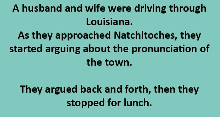 A couple driving through Natchitoches argued over its pronunciation—“Natch-ee-tush” vs. “Natch-i-toosh.” They asked a waitress at a diner to say it slowly, and she responded, “Na… tchi… to… ches,” settling the debate with laughter.