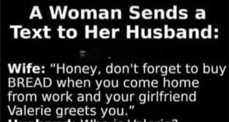 Wife: “Honey, don’t forget to buy BREAD when you come home from work and your girlfriend Valerie greets you.” Husband: “Who is Valerie?” Wife: “Nobody, I just wanted you to answer, to have confirmation that you saw my text.” Husband: “But I’m with Valerie right now,