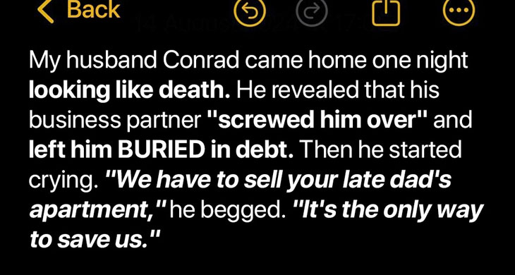 Four years into marriage, I learned that the person sharing your bed could also be the one stabbing you in the back. I never imagined it’d be Conrad—until he begged me to sell the only thing my father left me: his apartment.He claimed his business partner had betrayed him, that debt would bury us. In tears, he swore selling Dad’s apartment would save us. Blinded by love and grief, I agreed. The champagne popped the night the sale went through. “To new beginnings,”