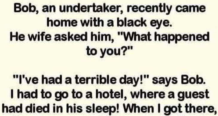 Bob, an undertaker, recently came home with a black eye.His wife asked him, “What happened to you?”“I’ve had a terrible day!” says Bob.“I had to go to a hotel, where a guest had died in his sleep! When I got there,
