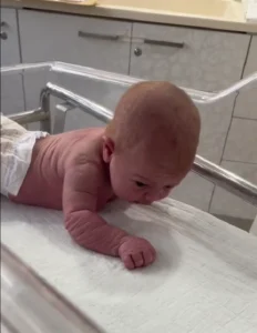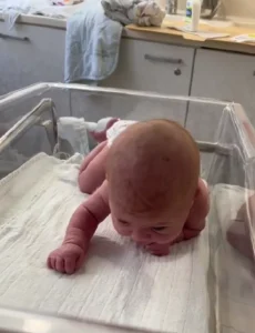 The extraordinary moment was caught on camera on March 2, 2023, less than three days after Nyilah’s birth. Arriving three weeks past her due date at 43 weeks gestation, the baby weighed a healthy 7 pounds, 6 ounces. Mitchell says she recorded the video on the advice of her mother, who witnessed the early crawling and urged her to document it.