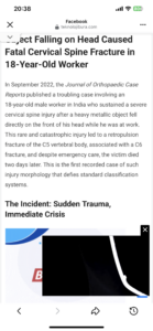This real-world case is a sobering reminder that even a single falling object can cause devastating spinal injury and death within hours. While such extremely rare injury patterns may fall outside existing diagnostic frameworks, they demand attention and underscore the importance of prevention, proper safety measures, and medical preparedness.