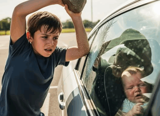 With trembling hands, Liam picked up a heavy rock from the curb. His small arms strained as he lifted it high. “I’m sorry, Mister Car,” he whispered, and with all his strength, he smashed it against the window. The glass cracked, spiderwebbing with each blow until it finally shattered.