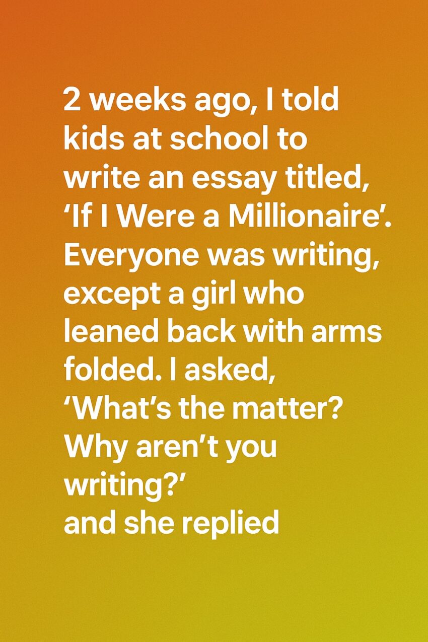 She looked at me with quiet confidence and said, “I’m just thinking… because I already feel rich, and I want to explain it the right way.” Curious, I encouraged her to continue. When I read her essay later, the opening line stopped me in my tracks: “I wouldn’t change much if I were a millionaire, because I already have everything that makes my heart full.”