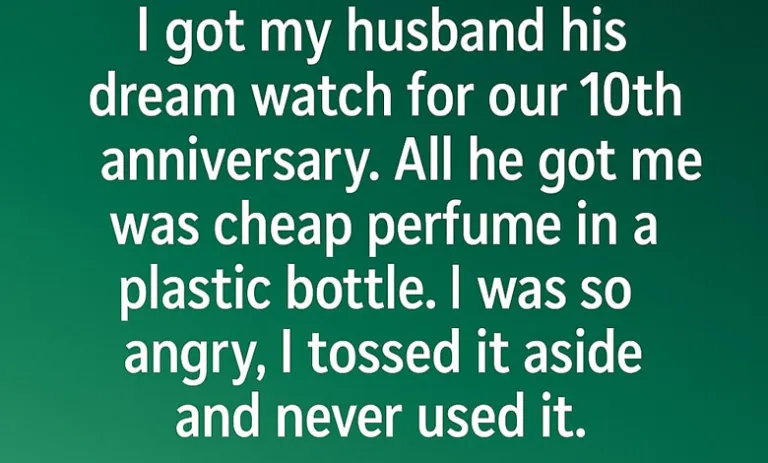 I got my husband his dream watch for our 10th anniversary. All he got me was cheap perfume in a plastic bottle. I was so angry, I tossed it aside and never used it. This was our last celebration because he died unexpectedly three weeks later. The pain of losing him was unbearable—I replayed that night over and over, angry not at the gift anymore, but at myself for letting disappointment overshadow love. I missed his voice, his laugh, even the way he reminded me to drink water when I got too busy.