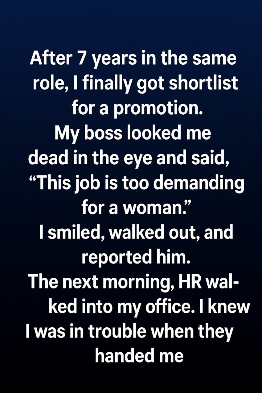 After seven years of dedication in the same role, I finally received news that I had been shortlisted for a long-awaited promotion. I walked into the meeting with hope, ready to show how far I had grown. Instead, my boss looked me straight in the eye and told me the job was “too demanding for a woman.” The words stunned me, but I kept my composure. I left the room with a calm smile, knowing what needed to be done.