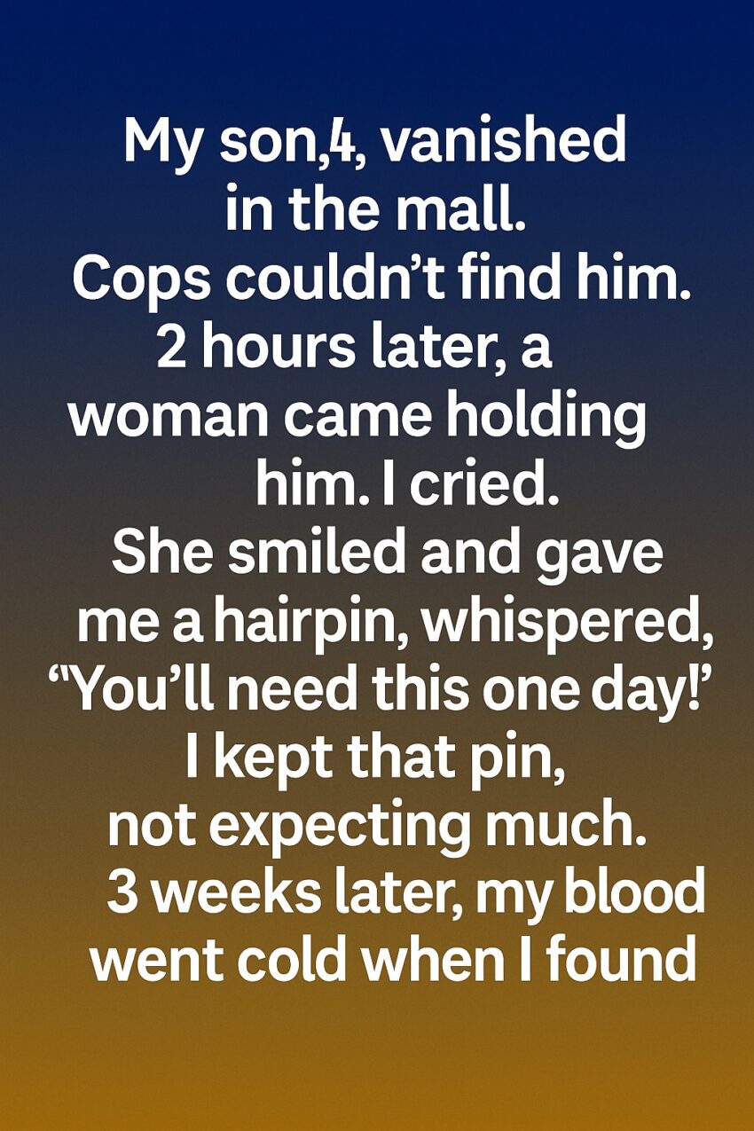 I cried. She smiled and gave me a hairpin, whispered, “You’ll need this one day!” I kept that pin, not expecting much. Three weeks later, my blood went cold when I found that same hairpin resting on my kitchen counter, though I clearly remembered placing it inside a sealed drawer the night before. At first, I told myself it was simple forgetfulness brought on by stress. But the more I stared at the tiny silver pin, the more I realized something about it felt unusual—almost purposeful. My son toddled into the room, humming a tune I’d never heard before, one he claimed the “nice lady” had taught him. Every time he hummed it, the hairpin seemed to shimmer faintly, catching the light in a way that didn’t seem quite natural. I couldn’t shake the feeling that the woman hadn’t just returned my son—she had left something behind.
