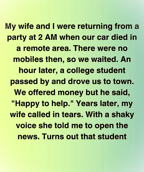 Years later, that moment returned suddenly and powerfully. My wife called me at work and urged me to turn on the news. There on the screen was the same young man who had helped us—now a doctor. But the news wasn’t about his medical achievements. He had lost his life while saving others. Seeing his face again brought tears to my eyes, reminding me of the kindness he had shown two strangers on a dark road.