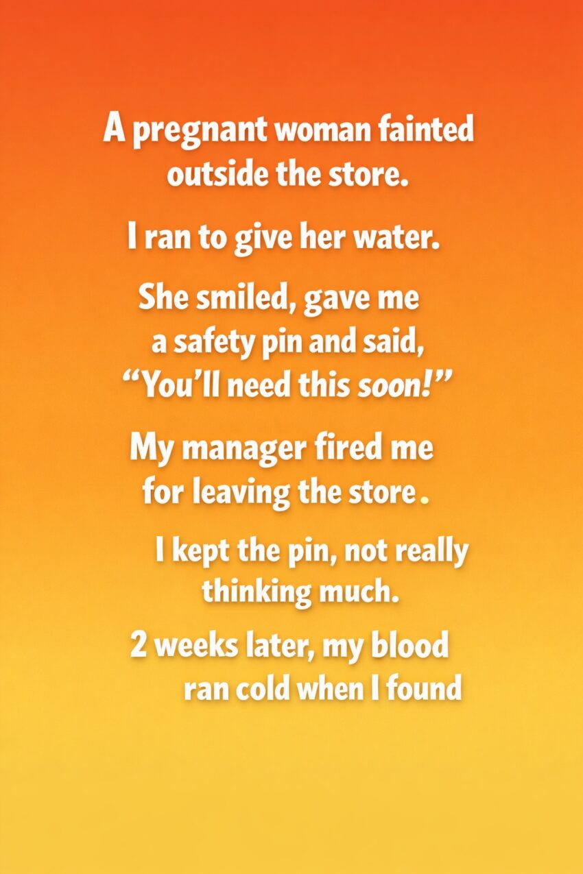 The day it happened felt ordinary until it suddenly wasn’t. I was working a long shift when I noticed a pregnant woman collapse just outside the store entrance. Instinct took over before fear or rules could catch up. I ran to her with a bottle of water, helped her sit up, and stayed until her breathing steadied. She smiled with a calm that surprised me, thanked me softly, and pressed a small safety pin into my palm. “You’ll need this soon,” she said, almost playfully. I didn’t understand what she meant, but I nodded anyway, relieved to see her standing again and walking away safely.