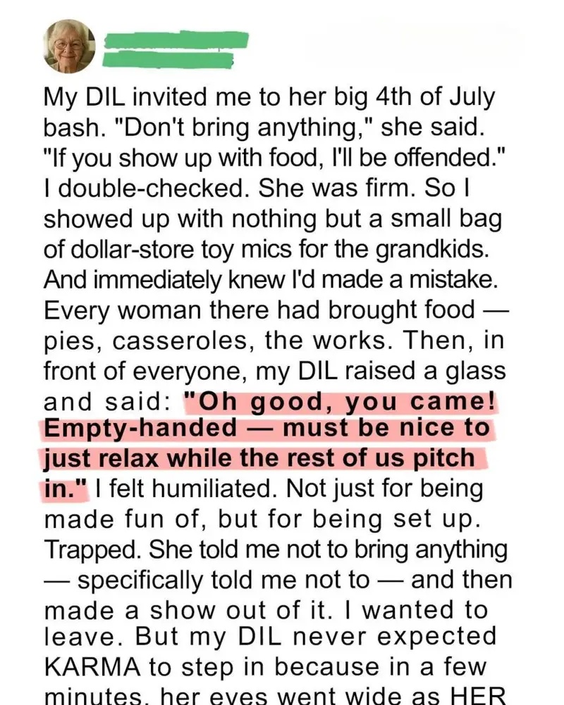“Don’t bring anything.” She even called me three times to repeat it, insisting she had everything covered. It felt strange because I was raised never to show up empty-handed, but I decided to respect her wishes. The only thing I brought was a small bag of toys for my grandkids, including little microphones with American flags on them.