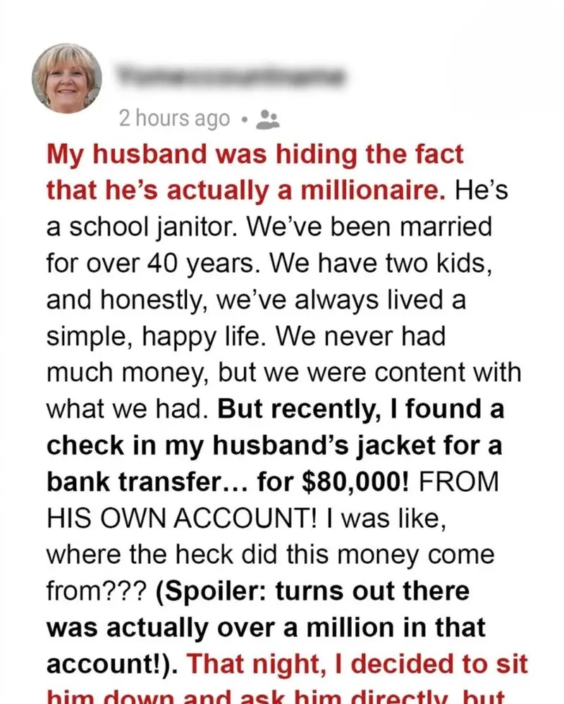 We built a simple life together — he worked as a school janitor, and I sold clothes at the department store. Our home wasn’t grand, but it was filled with laughter, memories, and the quiet pride that comes from honest work. So when I found a bank receipt showing an $80,000 transfer from Tom’s account to a charity I’d never heard of, my heart nearly stopped.