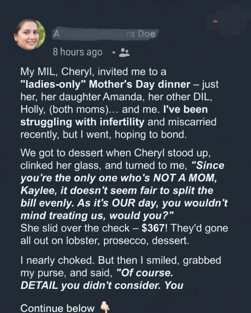 At the end of the meal, Cheryl slid the $367 bill toward Kaylee, calling it her “gift” to the “real moms.” Though hurt, Kaylee smiled and quietly paid only for her meal. Then, with calm determination, Kaylee revealed her news: she and her husband had been matched with a baby girl through adoption, and the baby was being born the very next day. Cheryl’s smug expression froze as Kaylee explained that this was technically her first Mother’s Day.