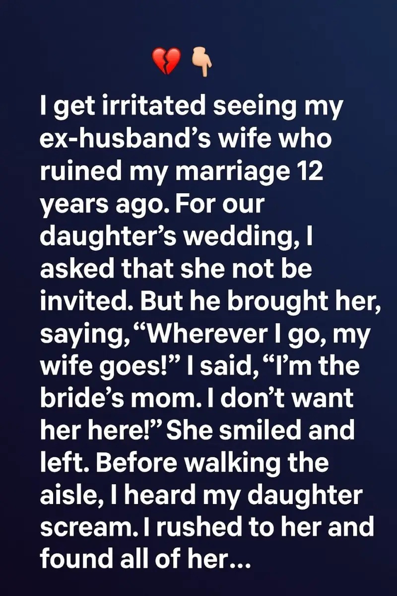 I get irritated seeing my ex-husband’s wife who ruined my marriage 12 years ago. For our daughter’s wedding, I asked that she not be invited. But he brought her, saying, “Wherever I go, my wife goes!” I said, “I’m the bride’s mom.